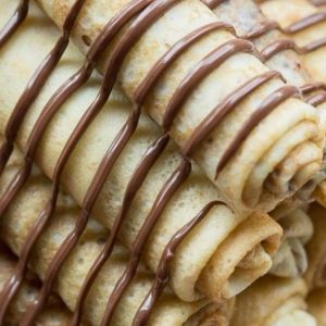 Experimente também esse delicioso crepe de banana com calda de chocolate!