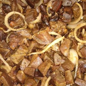 - Pique o fígado em tirinhas, tempere com sal, pimenta do reino, cominho, alho, vinho e suco de limão, deixe marinar bem.
