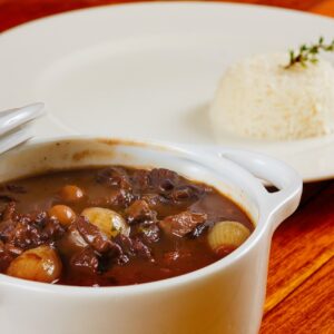 Feijão preto ou carioca, temperado com alho e louro, adiciona riqueza e profundidade ao prato, além de aumentar seu valor nutricional com proteínas e fibras.