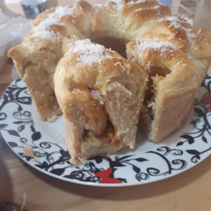 Prontinho, minha filha! Sua rosca de leite condensado com coco ralado tá pronta pra servir! Chama todo mundo pra comer que isso aqui é sucesso garantido!