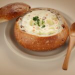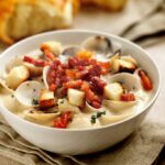Carregando... Remover Salvar Salvar Frutos do Mar Clam chowder - sopa de moluscos no pão italiano Tempo 1h Porção